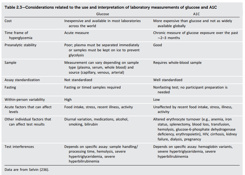 El documento hace un contraste profundo entre A1c y pruebas de glucosa (Tabla 2.3).