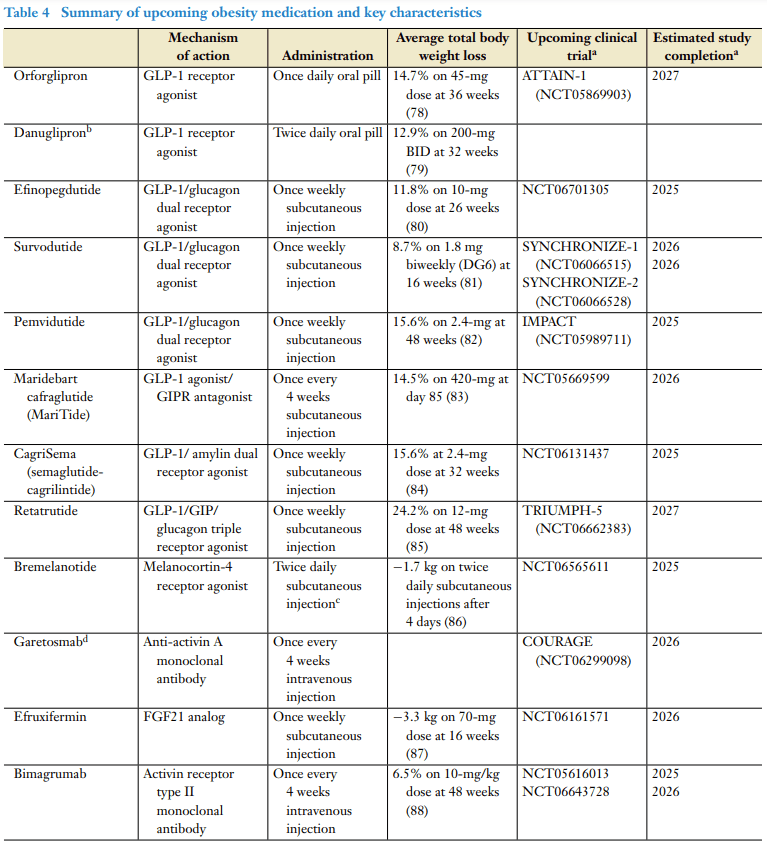 • Tirzepatida: ≈21% de pérdida de peso, beneficios en PA, HbA1c, AOS.