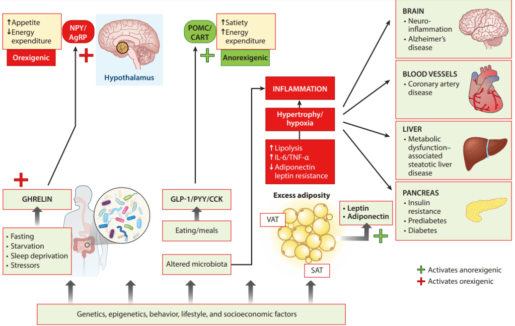 • Disbalance entre vías orexigénicas (NPY/AgRP) y anorexigénicas (POMC/CART) a nivel hipotalámico.
