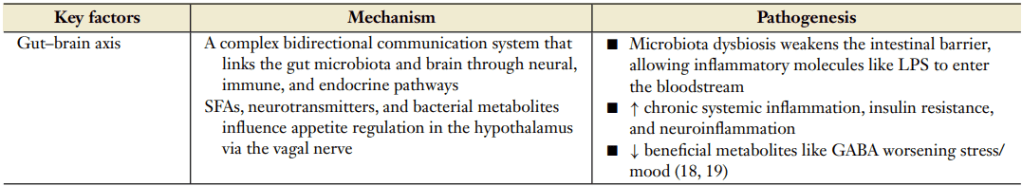 • Alteración de metabolitos (AGCC, GABA) con impacto sobre apetito, estrés y conducta alimentaria.