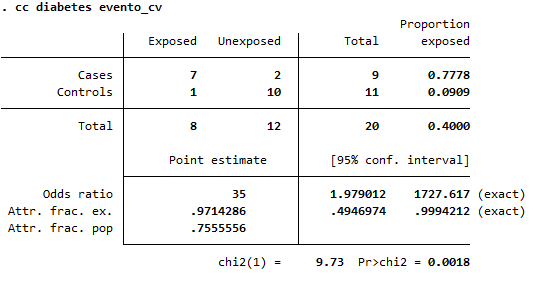 Se encontró una fuerte asociación entre diabetes y evento cardiovascular (OR=35; IC95%: 1.98–1727.6; p=0.0018). El 77.8% de los casos estaban expuestos frente al 9.1% de los controles. Aproximadamente el 97% de los eventos en diabéticos y el 75% en la población total serían atribuibles a la diabetes. Sin embargo, la amplitud del intervalo de confianza indica baja precisión, probablemente debido al tamaño muestral reducido.