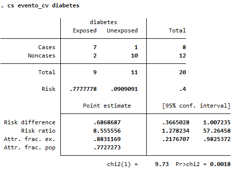 La presencia de diabetes se asocia fuertemente con el desarrollo de eventos cardiovasculares (RR=8.56; IC95%: 1.28–57.26; p=0.0018). El riesgo absoluto en diabéticos fue 77.8% frente a 9.1% en no diabéticos, con una diferencia absoluta de 68.7%. Aproximadamente el 88% de los eventos en diabéticos y el 77% en la población total serían atribuibles a la diabetes. Sin embargo, la amplitud de los intervalos de confianza sugiere imprecisión, probablemente por tamaño muestral reducido.
