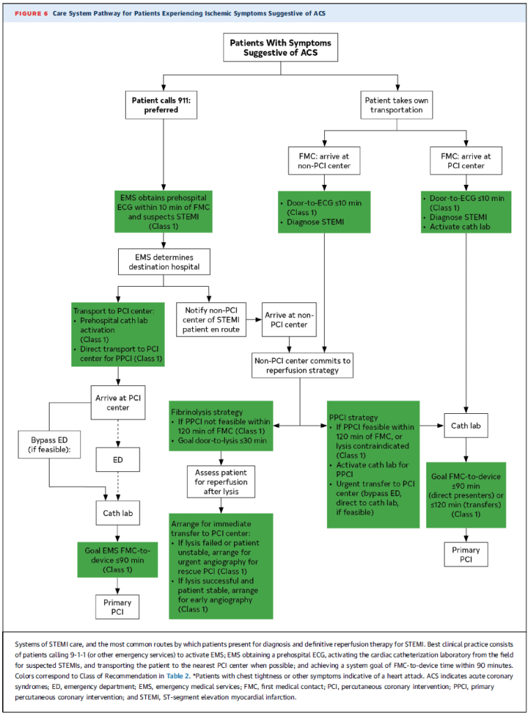 - El EMS debe notificar con anticipación al hospital receptor y activar el equipo de cateterismo para reducir el tiempo hasta la reperfusión (Clase 1, Evidencia B-NR).