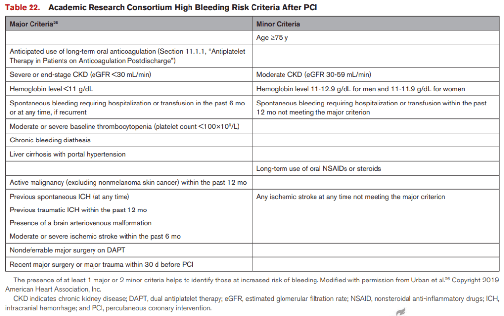 Criterios de alto riesgo de sangrado según el Academic Research Consortium (ARC) después de PCI