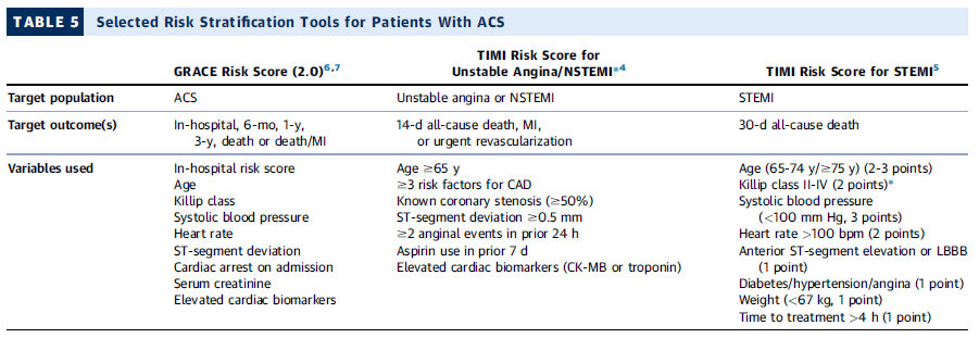La tabla muestra tres escalas utilizadas para evaluar el riesgo en pacientes con síndrome coronario agudo (ACS).
