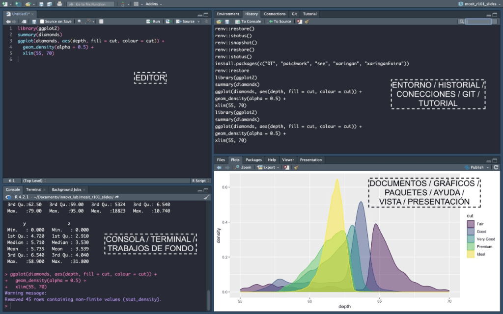 Lugar donde se ejecutan los comandos en tiempo real. Se pueden escribir líneas de código y ver los resultados directamente. - Entorno (Environment): Donde podemos explorar los elementos que hemos cargado en R. En este panel también podemos visualizar la historia de códigos y conexiones entre otros.