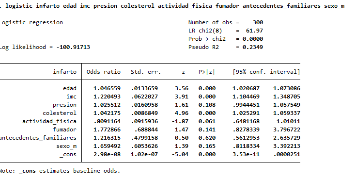 - El OR de la constante (_cons = 0.0298) representa la probabilidad base de infarto cuando todas las variables son cero (no se interpreta clínicamente).