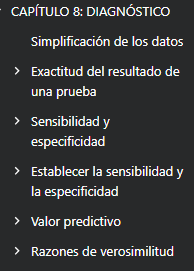 Sensibilidad, especificidad, valor predictivo, prueba de oro y razón de verosimilitud.
